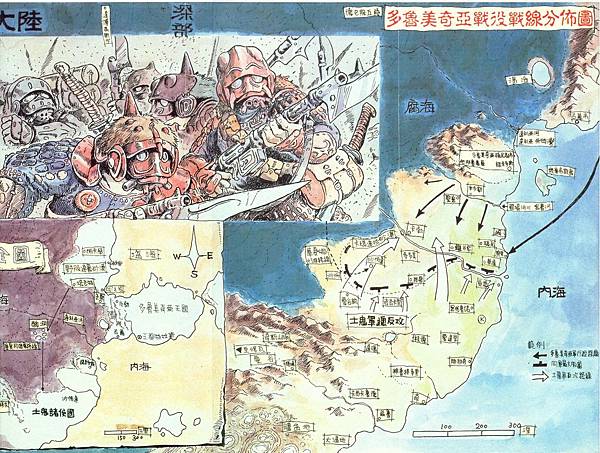 右邊那張進軍圖裡頭,左下方的「膿盆地」不就是個超大型垃圾坑嗎?還有看到裡頭有提到古代科技的進步,進步到可以隨意的調整生命,「據說馬在以前是胎生的呢。」看到這段話的時候,我只想到現實存在的基因科技,假使讓他繼續發展並且成功的話,那應該也是要走上那條「隨意調整」生命的地步。看到這裡我真想哭。或許《風之谷》也是在預覽著我們的將來,顯露出一丁點的發展科技的後果,假使我們真的認為人類可以隨心所欲,無視生命與自然之時,那也許我們的後代就要生活在有毒的腐海之中苟延殘喘了。